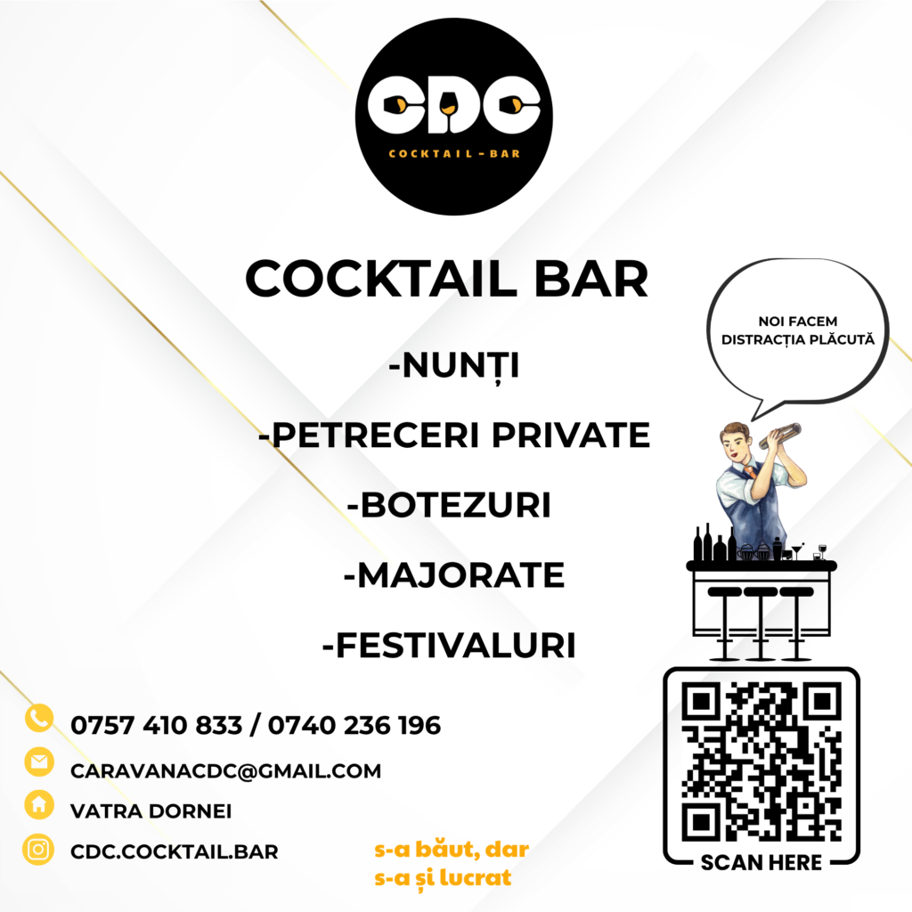 Dacă ești în căutarea unui serviciu complet, CDC Cocktail Bar din Vatra Dornei oferă bar mobil pentru evenimente, cu focus pe experiență și calitate.